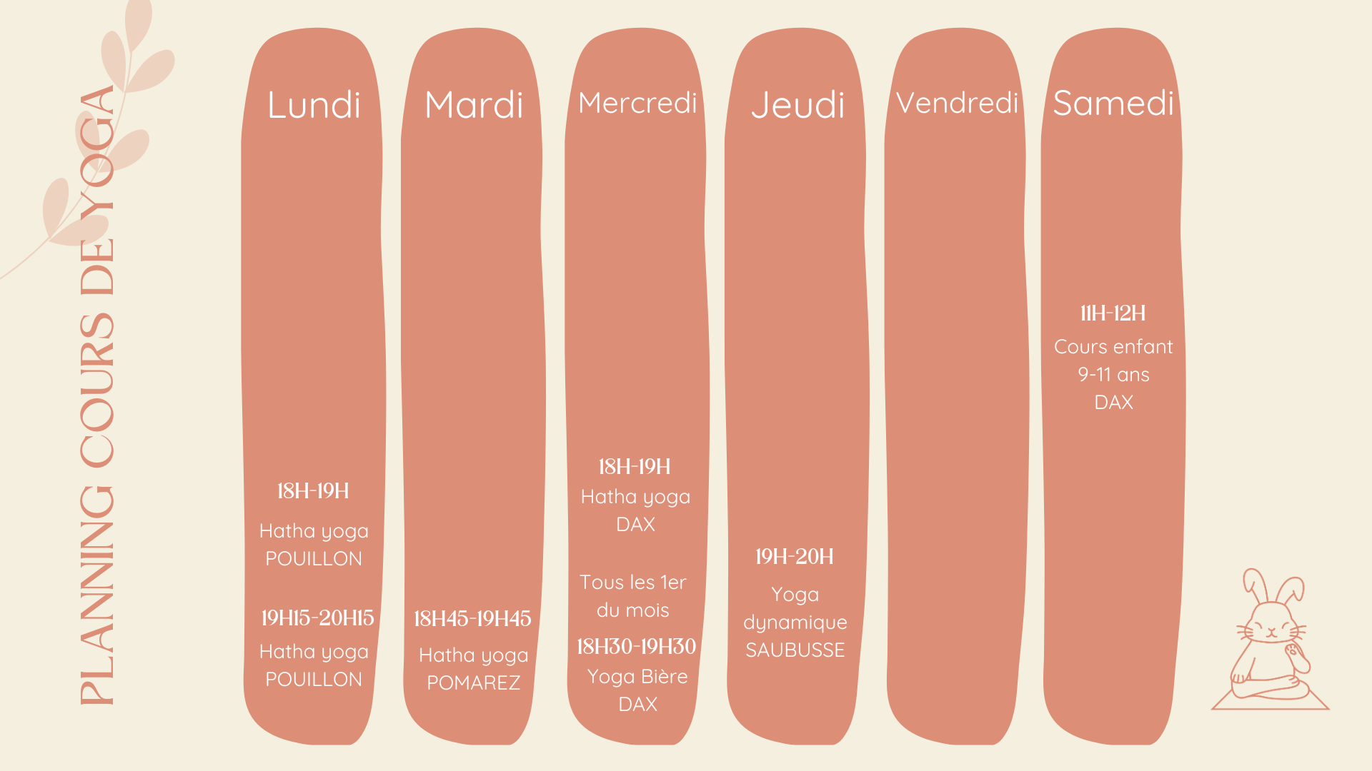 Que ce soit à Dax, ou ailleurs dans les Landes, vous trouverez forcément un cours de yoga près de chez vous. Pour toute question sur le planning, n’hésitez pas à me contacter.